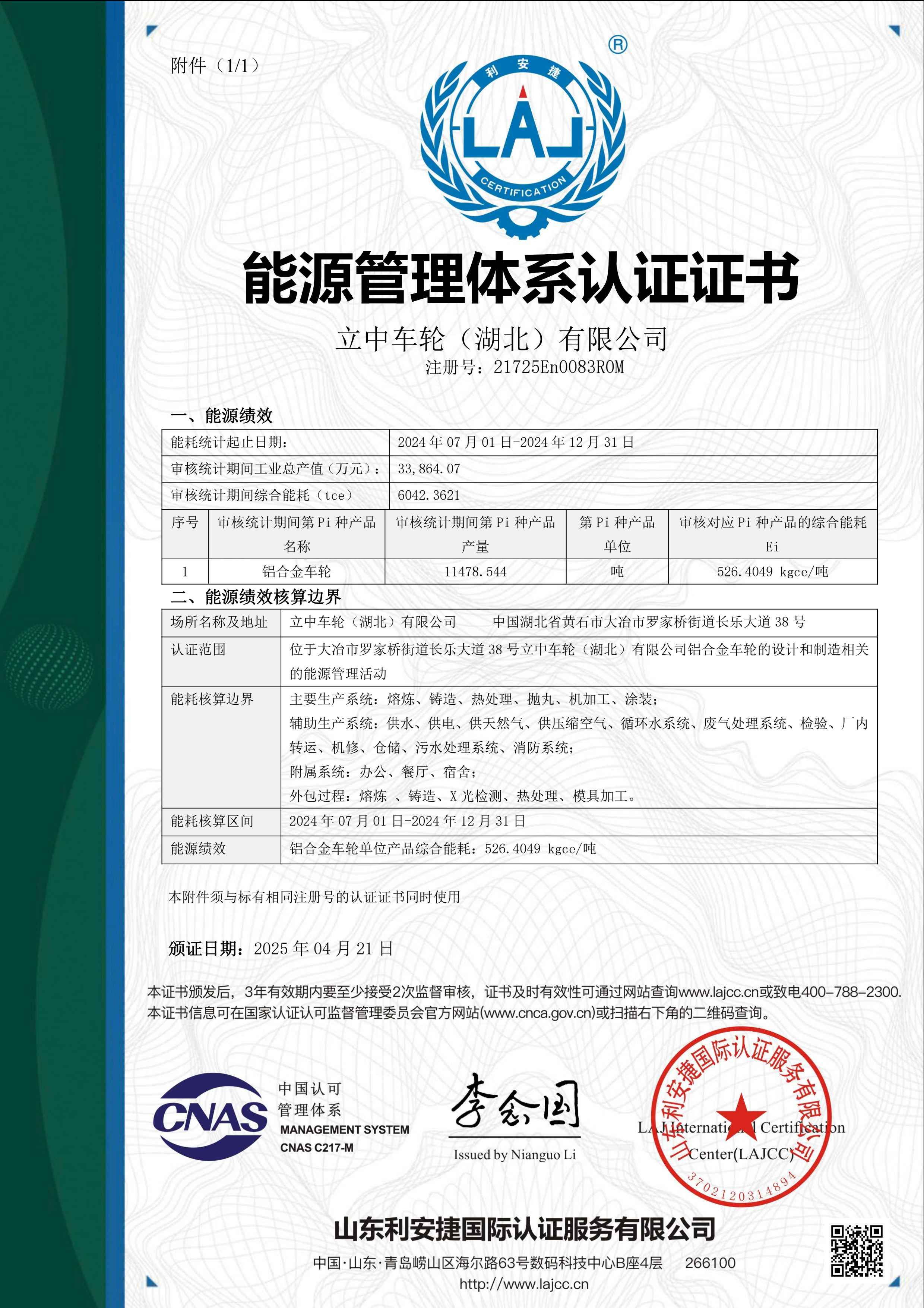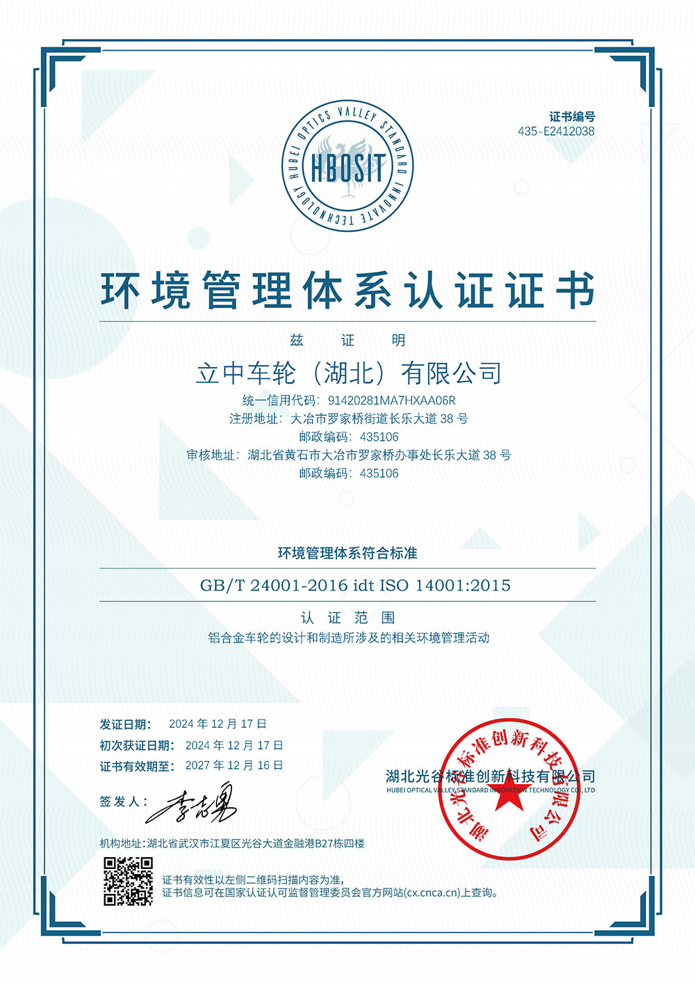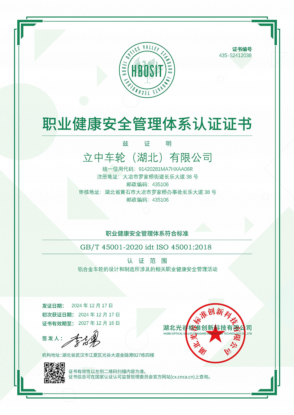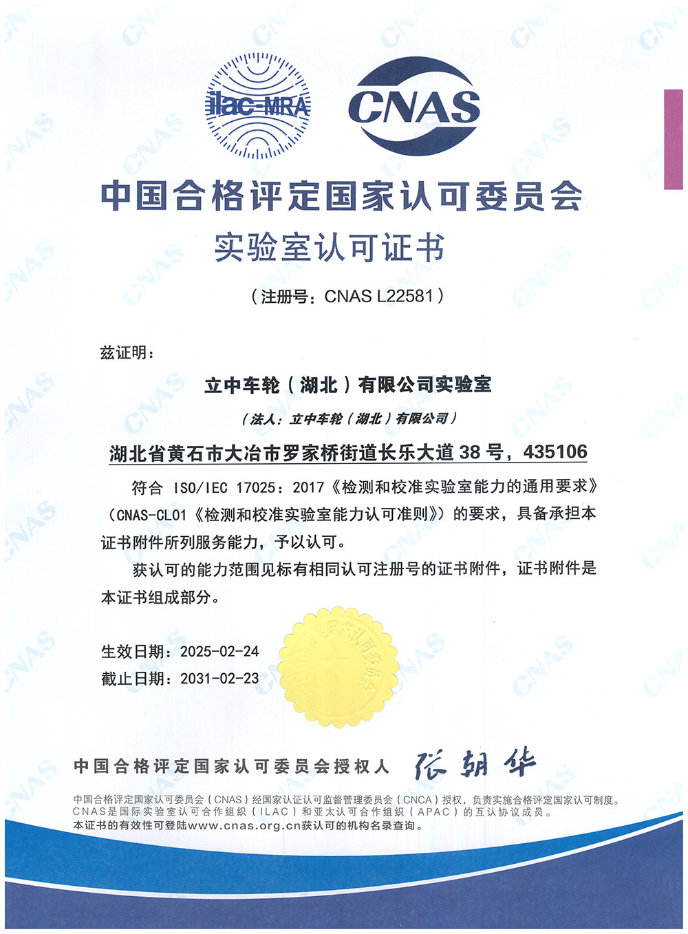 Die Lizhong Rad Gruppe ist derzeit zertifiziert nach IATF 16949:2016, ISO14001, ISO/IEC 17025, TUV (Deutschland), TIP (General Motors), CEP (Russland), VIA (Japan), INMETRO (Brasilien), ARAI (Indien), usw.